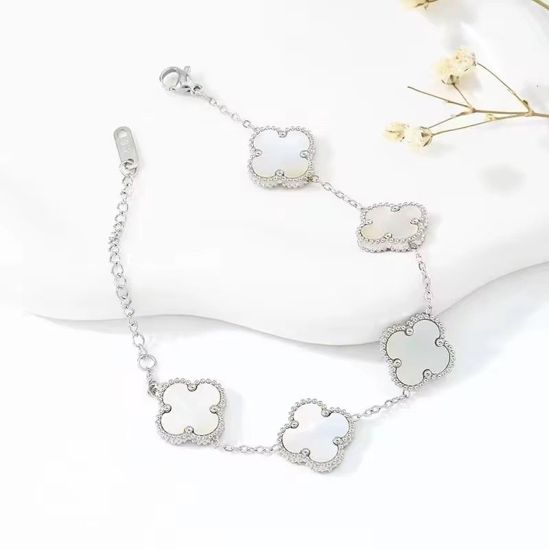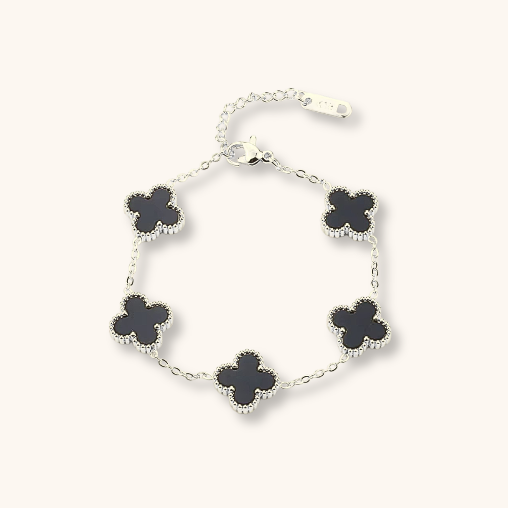 CLOVER apyrankė su elegantiškais dobilų lapų motyvais – rinkitės juodą arba perlamutrinę. Prabangus sidabro atspalvis sukuria tobulą harmoniją ir suteikia šiam gaminiui unikalaus žavesio, tinkančio tiek kasdieniam stiliui, tiek ypatingoms progoms.